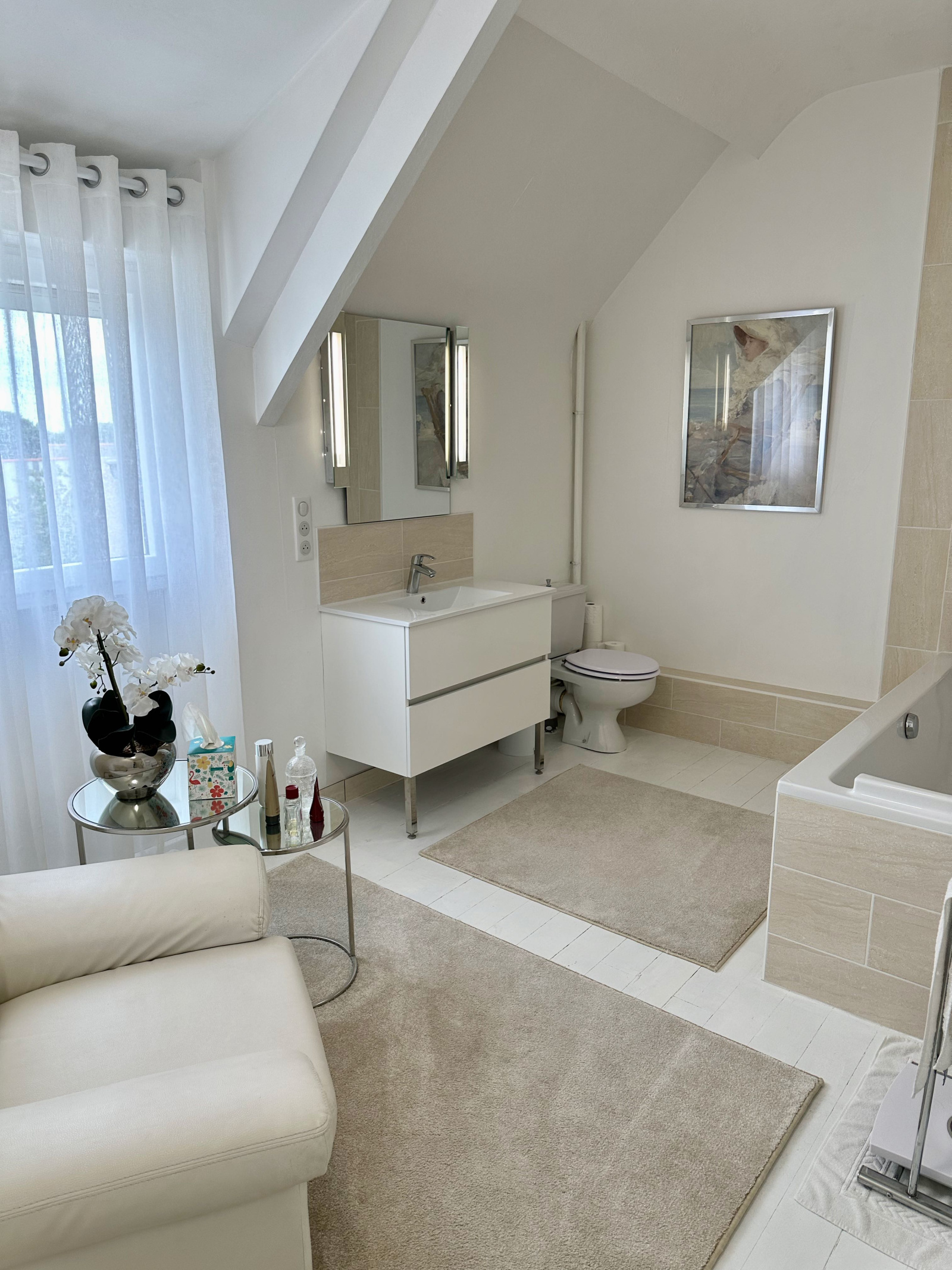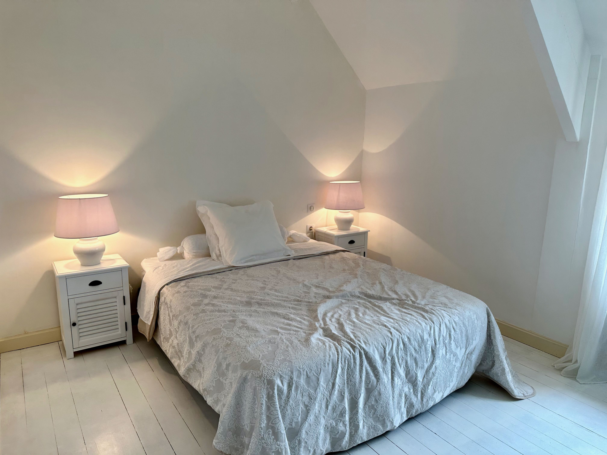 A l'étage: palier desservant 3 chambres sur parquet, salle de bains avec WC