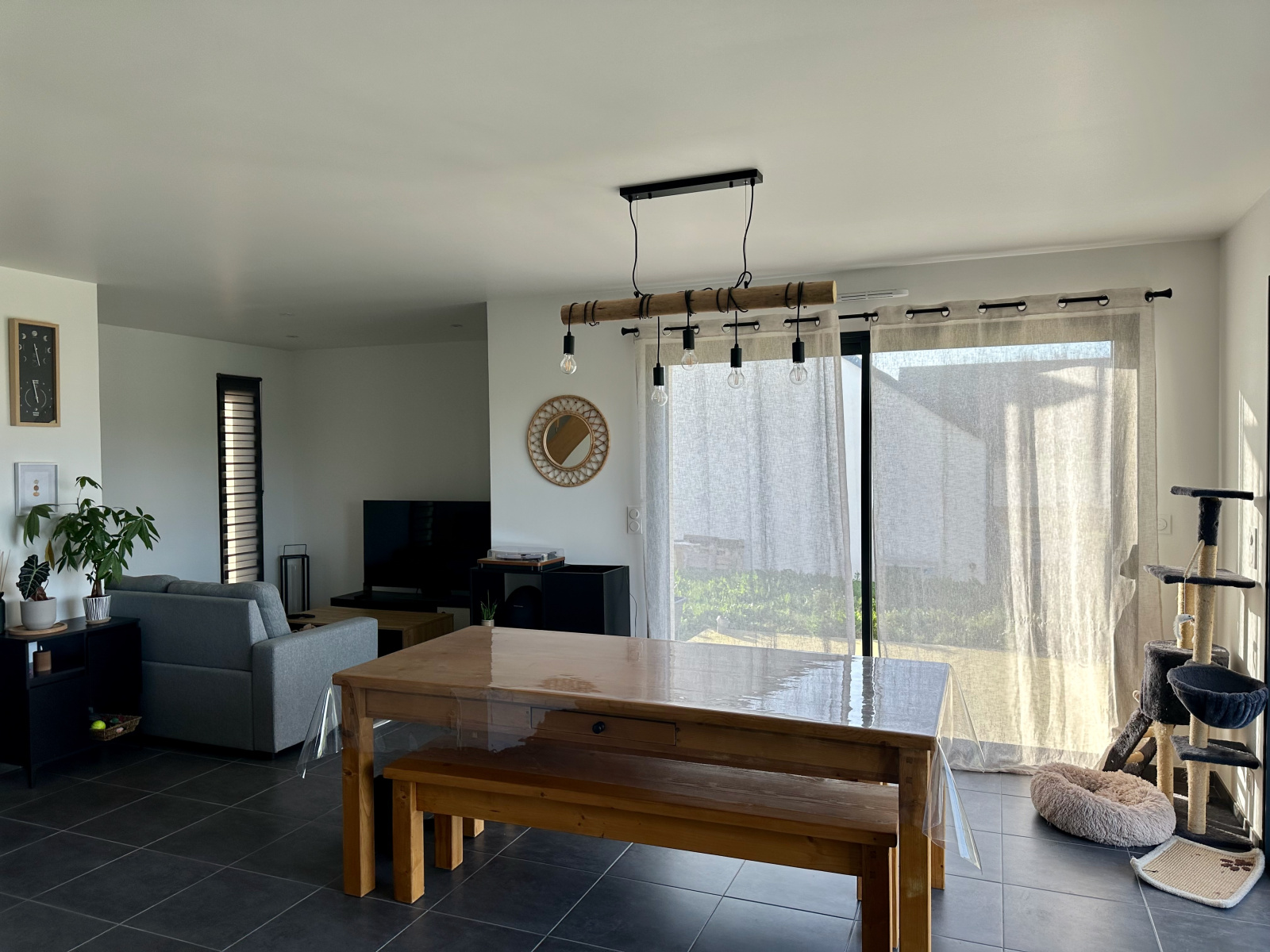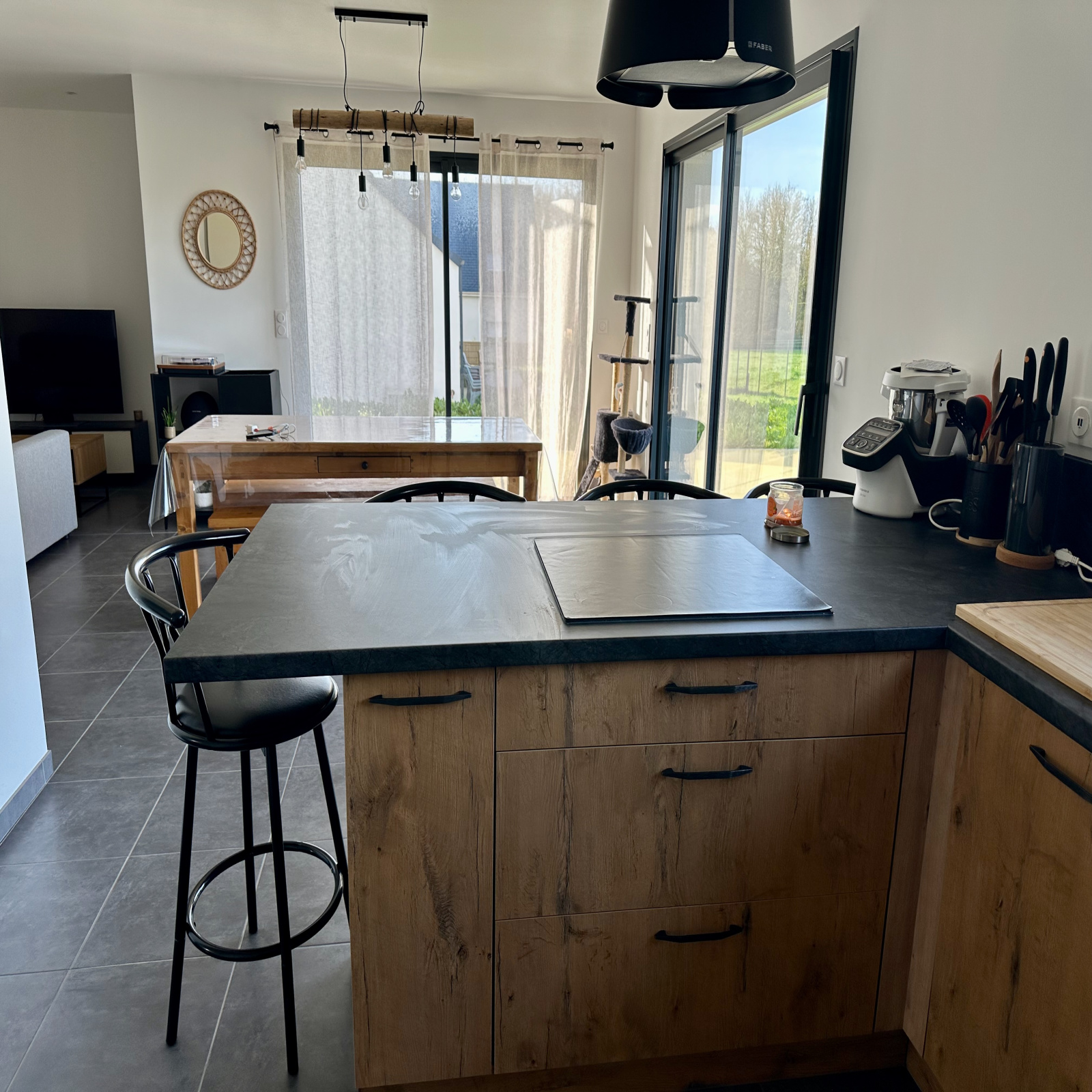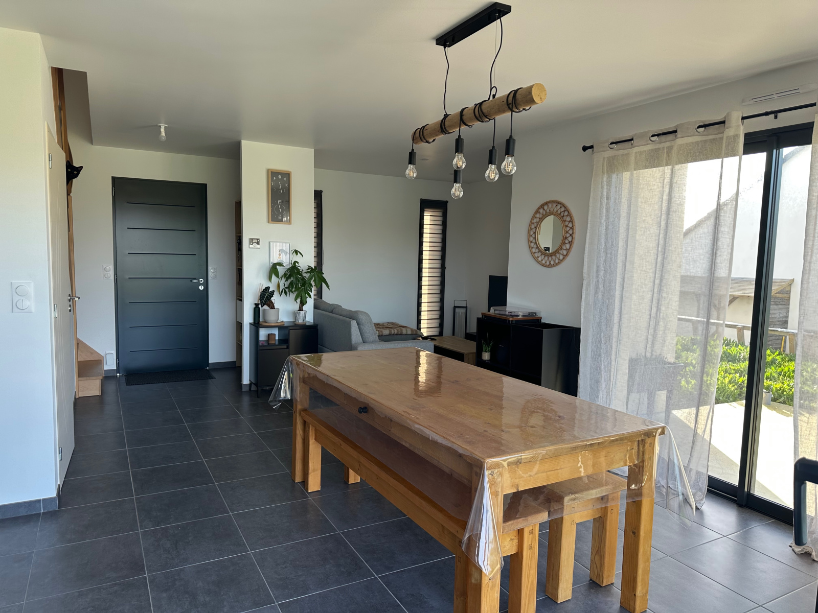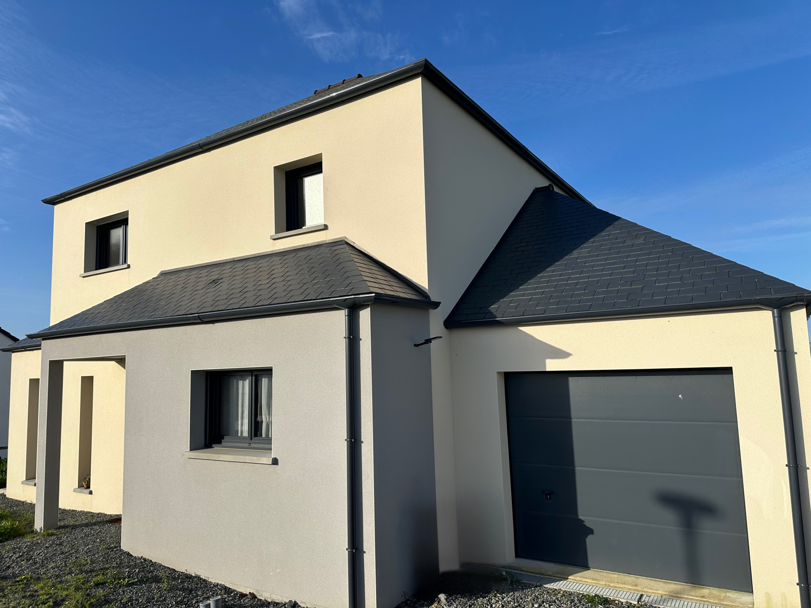 au rez-de-chaussée : entrée, séjour-salon, cuisine ouverte aménagée et équipée, une chambre avec salle d’eau et placards, WC, garage